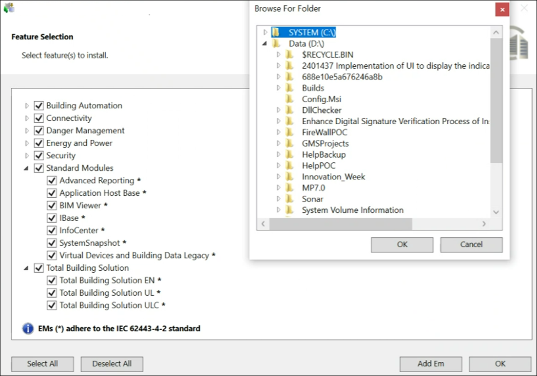 If any of the mandatory extension is not IEC certified, a message “EMs (*) adhere to the IEC 62443-4-2 standard” displays in the Feature Selection dialog box.