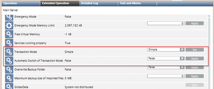The Transaction Mode is a property of the Main Server. It sets how data is written to the project database. Its value during normal operation is Logging. It may need to be switched to Simple to speed up bulk engineering activities (such as data import, backup, and so on). This switch can be performed manually, or you can set the system to always switch the Transaction Mode automatically (recommended).