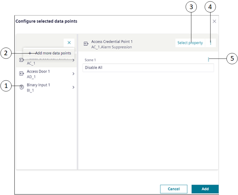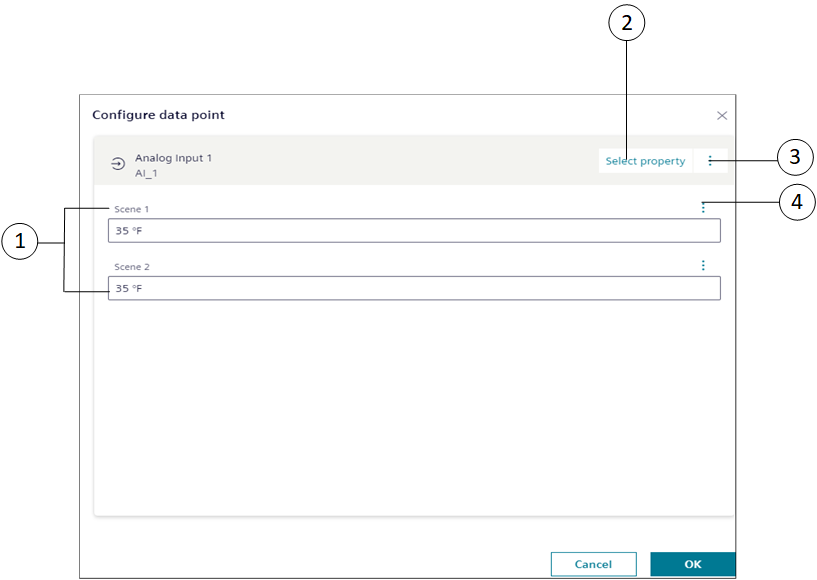2 | Select property | Allows you to select a different property of the data point. By default, when you add a data point to a scheduler, the Present Value property is set for the point. |