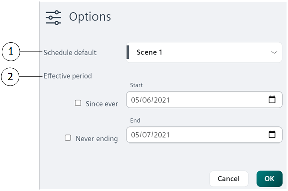 2 | Effective period | Allows you to specify the start and end time period for a scheduler. |