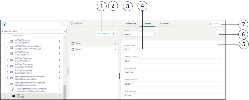 Management station scheduler make use of scenes that are objects which allow you to create multiple operating modes for a scheduler. You can add and associate data points with the scenes and specify the values for the data points for different scene modes such that when the scheduler is in that particular mode, the data point will reflect that value. For example, consider that you have created 3 scenes, Office Opening Time, Lunch Time, and Office Closing Time and you want to have different temperatures in each of the 3 scene modes. In this case, you can associate 3 analog output points to each of the scenes with values that should be present at each of the 3 scene modes.