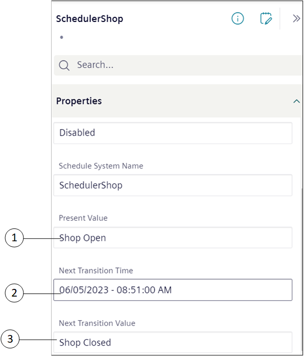 3 | Next Transition Value | Displays the value of the next scheduler entry in the selected scheduler. For example, assume that the present value of scheduler is shop open and the next scheduler planned is shop closes at 6.00 pm, then “Shop closed” value is displayed. NOTE: The next transition value is visible in advanced mode. |