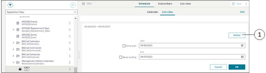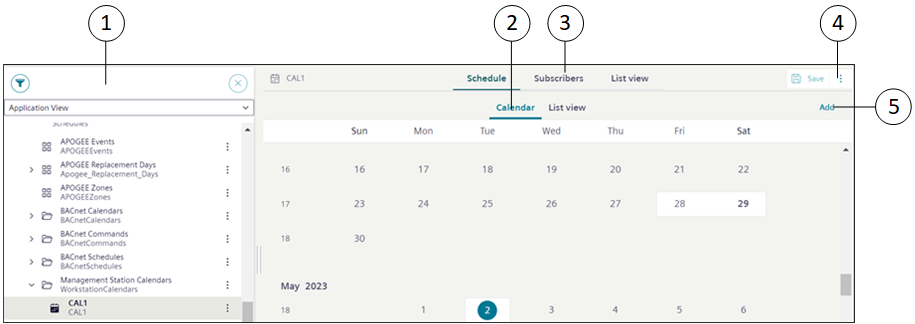 2 | Calendar object (workspace) | Displays the Management station calendar object in the Calendar view or List view. |