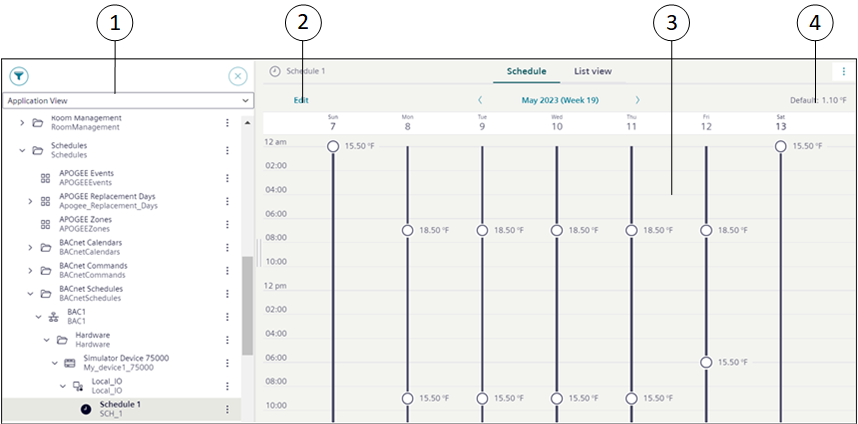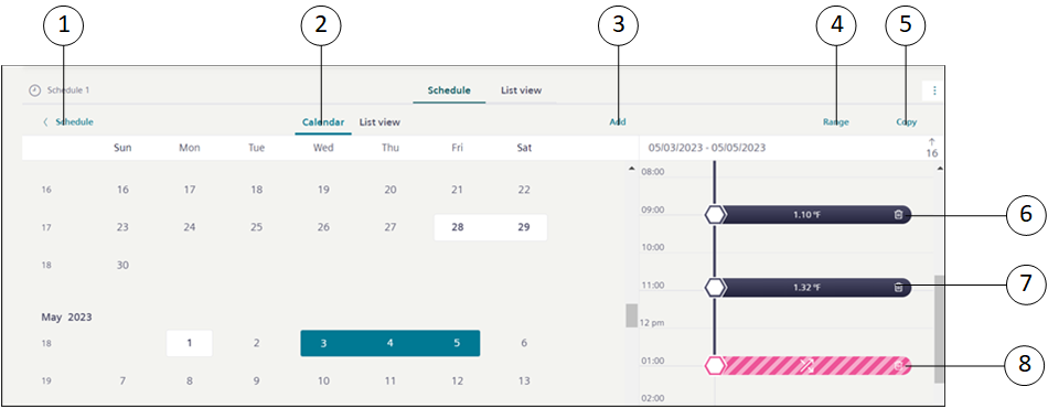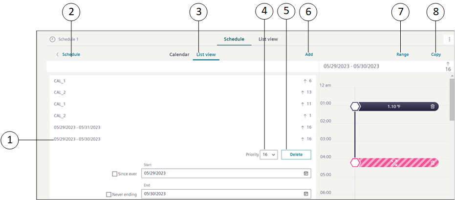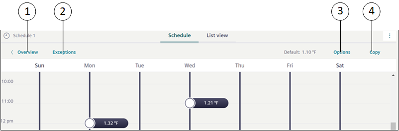 3 | Schedule Overview | Displays information of the schedule entry and exception entry of the selected schedule. It also displays either a value or Scheduling disabled text for each schedule entry. |