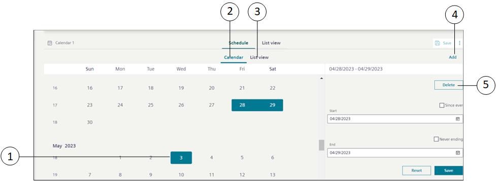 2 | Exceptions | Displays the Calendar view and List view from where you can add exceptions to the schedule. |