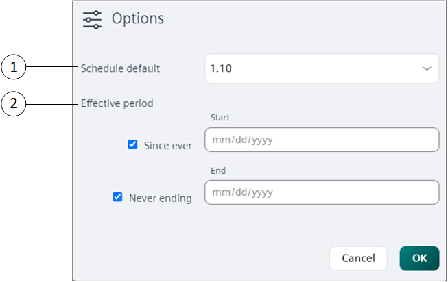 3 | Options | Displays the Options dialog box that provides options to relinquish the default value. You can also configure the effective period for the schedule. |