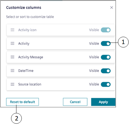 1 | | Toggle to display or hide columns. By default, the Activity icon column is always visible. |