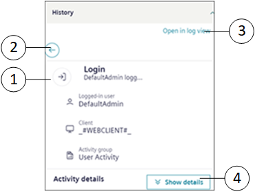 4 | History | Displays the history of selected log entry in Master pane (for example, activities or events that include at least one log record). |
