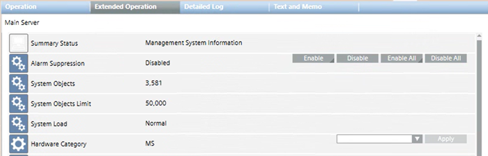 In Engineering mode, when you select the Main Server object in System Browser, information about the hardware category and system limits displays in the Extended Operation tab.