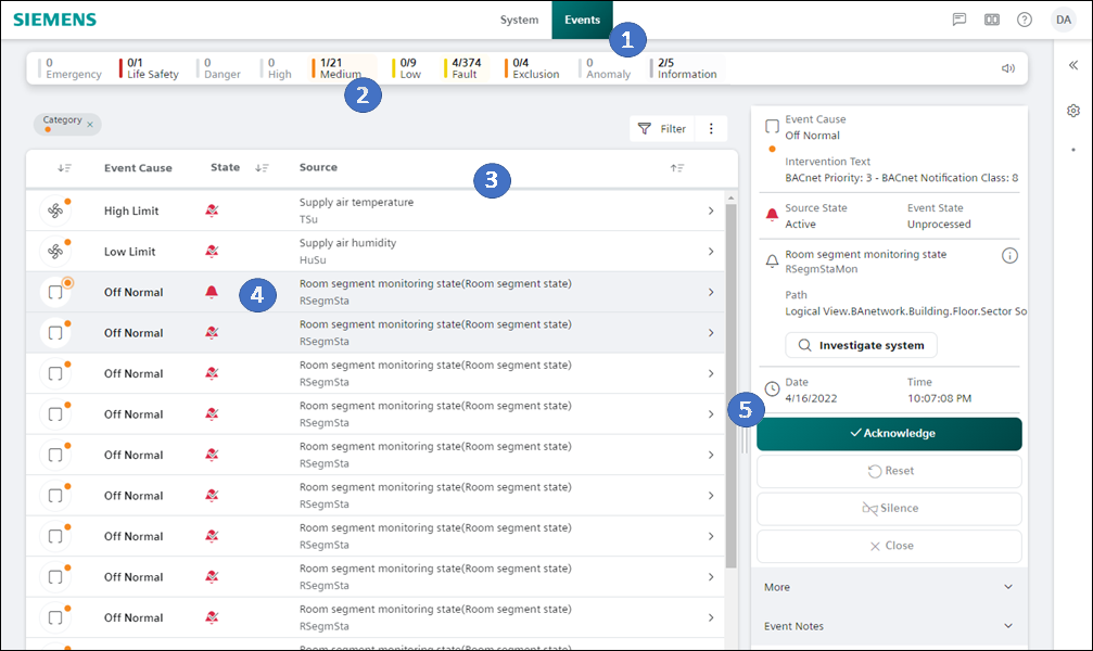 Scenario: A fault occurs in a room or a plant that is recognized by the system with the Common Event object and is displayed in the Summary Bar. All faults belonging to a room are displayed. This also applies to objects that are not in the system database through Application Modeling. All plant faults that are not triggered via an intrinsic alarm are displayed.