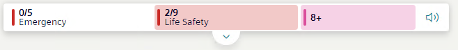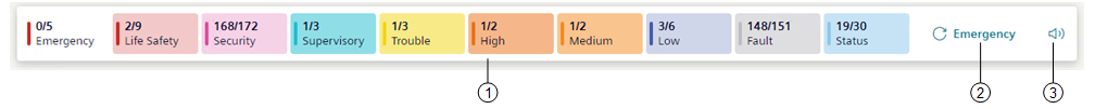 In Flex Client web/desktop app, the Summary bar is located below the horizontal navigation bar, and has a series of event lamps, which provide an overview of the events in the system, grouped by category.