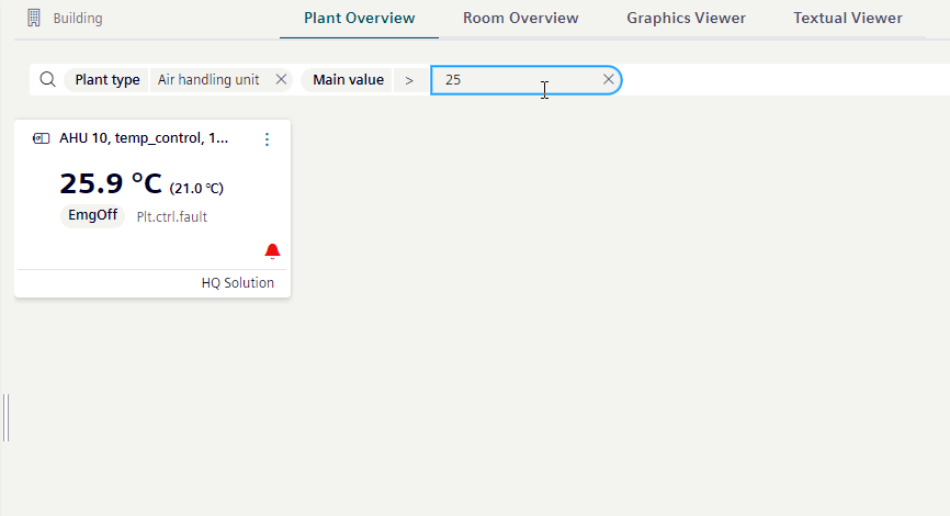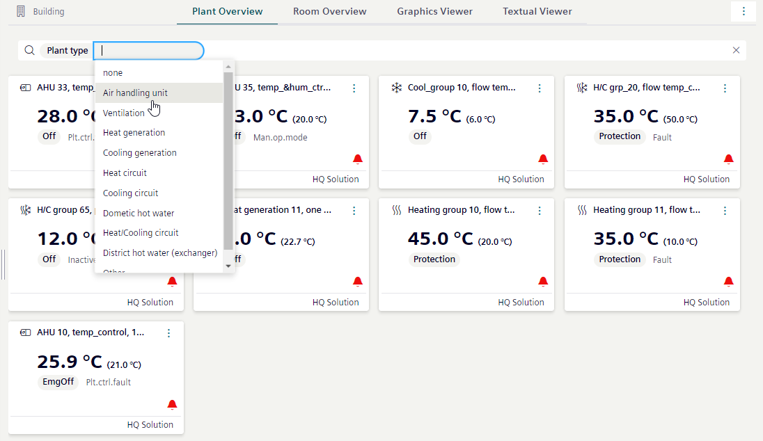 You can use filters to refine the view of the plants. Using two or more filters further limits the view (AND operand). The filter applies immediately upon entry. The Plant Overview might display without content for a brief period.