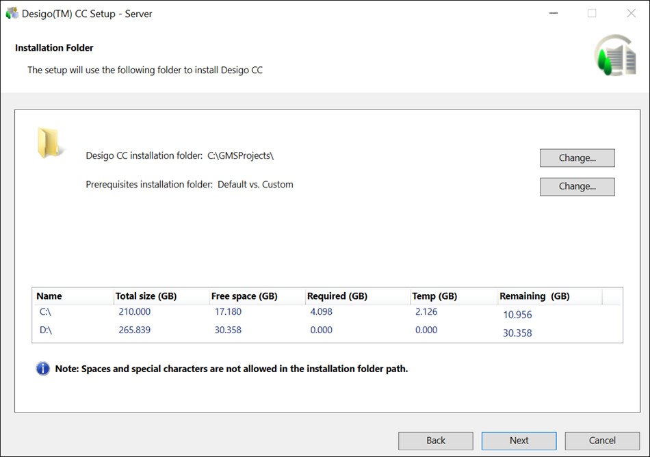 In the Installation Folder dialog box, accept the default installation directory location [Installation Drive]:\[Installation Folder] for the installation or choose a new location by clicking Change. The Installer calculates and displays the disk space required for the selected setup type installation on the selected drive and the temporary disk space required only for the time of installation (always calculated only for the system drive). Click Next. NOTE 1: No illegal characters or sequences are permitted in the directory path. NOTE 2: If a negative number in red displays in the Remaining Space field, you must re-run the setup after freeing the required disk space. (See Tips to Free Up Disk Space in Installation Folder > Verify the Installation Environment) NOTE 3: The installation folder will inherit the ACL rights (Access Control List) from the installation drive. For example, if C is the installation drive the folder C:\[Installation Folder] will inherit the ACL rights from C drive. These rights define permissions given to users related to operations for working with the folder. For more information, refer to the Cybersecurity Guidelines document (A6V11646120 ) for securing this. NOTE 4: If the installation path is customized in the Brand Config.xml file, then customized path displays. If no path is configured in the Brand Config.xml file, then the SystemDrive\GMSProjects\ is set as the default installation path.