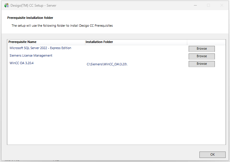 The Prerequisite Installation Folder is displayed and installer can browse the new installation path to install Desigo CC Prerequisites.