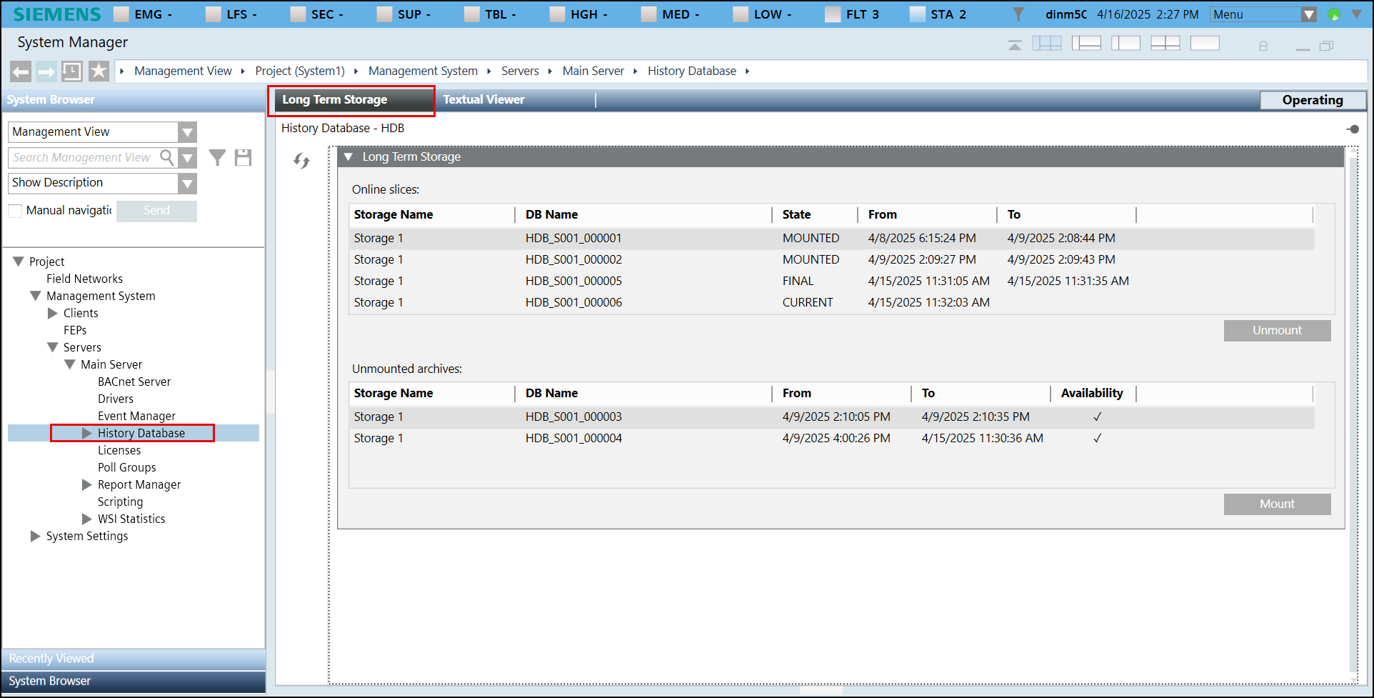 - After performing an unmount operation, if you execute any reports such as Trend Report, Activity Report, or Alarm Report, you will not be able retrieve the historical data from the Long Term Storage slice that is unmounted.