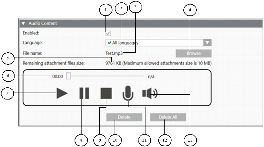 4 | Browse | Allows you to browse the local file system and upload a file as audio content. You can upload MP3 and WAV files. |