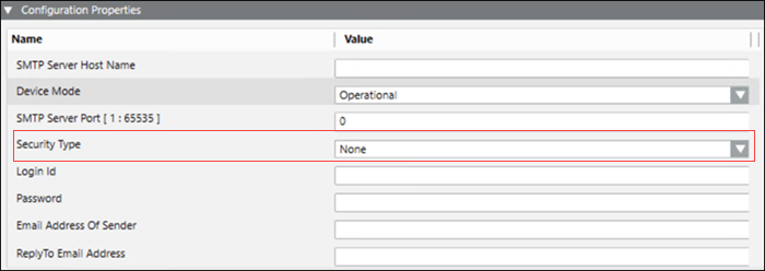 - When setting up the SMTP Email server, in the Configuration Properties expander, configure the Security Type as either: