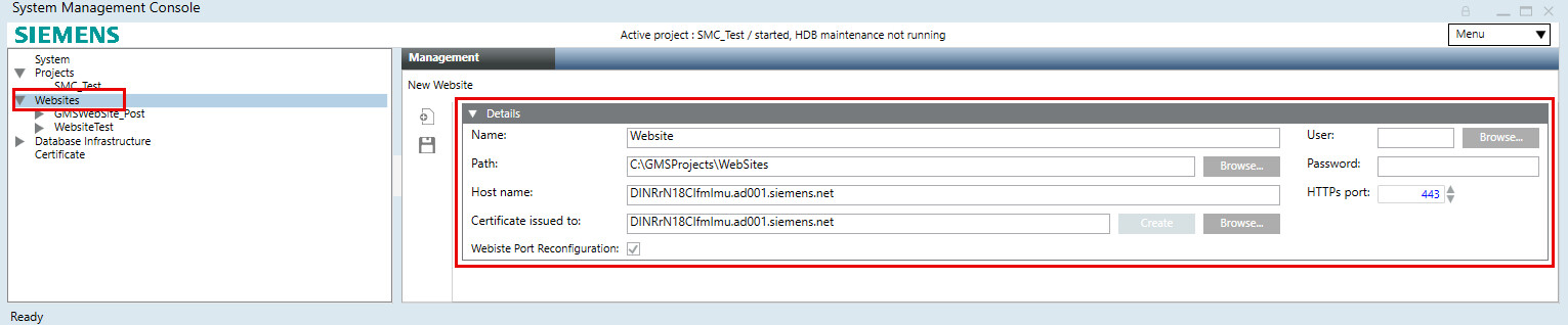 User | Browse for the website user from Current station or from Other Domain. It could be the local/domain user and a member of the IIS_IUSRS group. If you select a user that is not a member of the IIS_IUSRS group, the SMC prompts you to add that user to the IIS_IUSRS group. The user must also have Allow log on locally as Service right set. For more information, refer Cannot Create or Save Website in Troubleshooting Websites and Web Applications NOTE: The website user, by default, displays as web application user. |