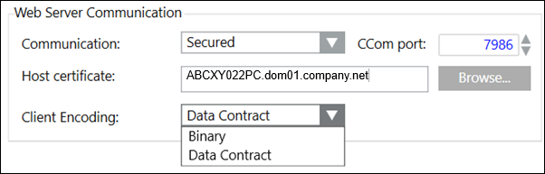 Client Encoding | With Web Server Communication mode as Secured/Local, the Client Encoding (Data Contract/ Binary) becomes available in the Web Server Communication. In the Client Encoding drop-down list, by default, Data Contract is displayed. |