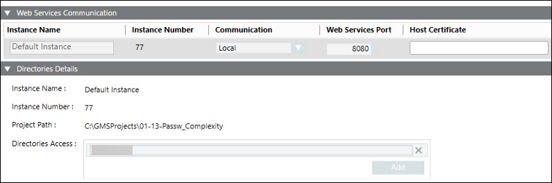 Once the WSI extension is added to the project, during the project modification you can configure the Web Services Settings for multiple WSI instances, including the instance name, the type of communication, web services port, and the host certificate.