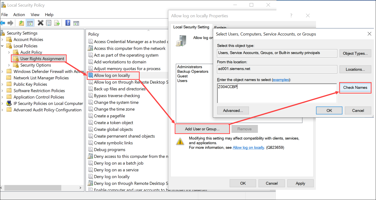 Setting Allow log on locally as a service right for a Windows local/domain user