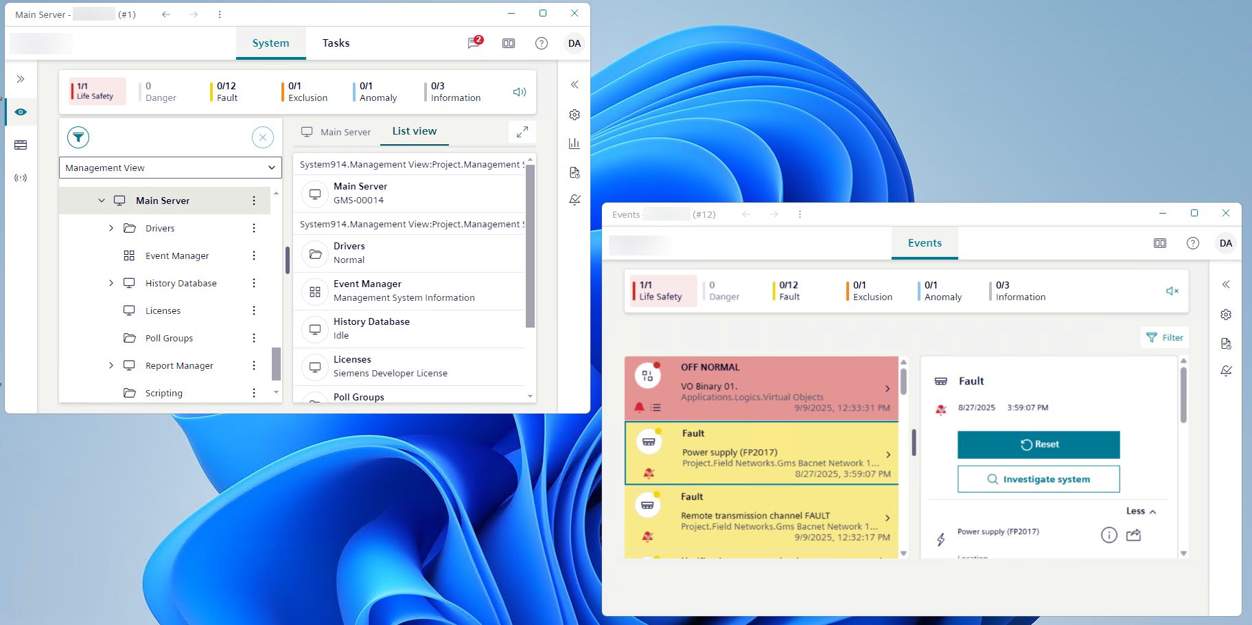 - The Investigative treatment bar displays along the top of the System window (main and any additional ones) as well as along the top of the separate Events window. The object that caused the alarm is selected in the tree of the main System window as usual. You can investigate events from the main System window or any additional windows as usual.