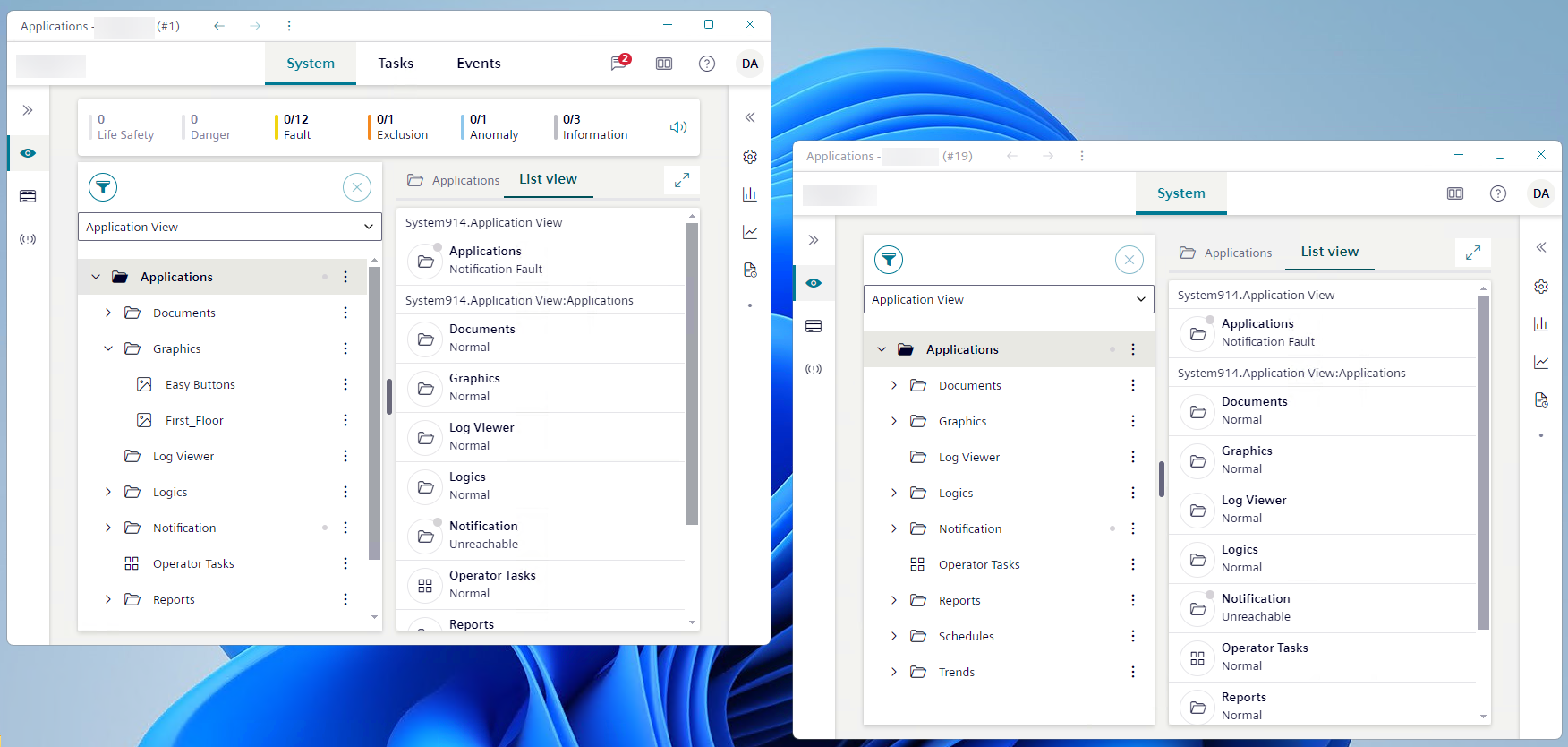 - The object in alarm appears selected in the tree of the main System window as usual.