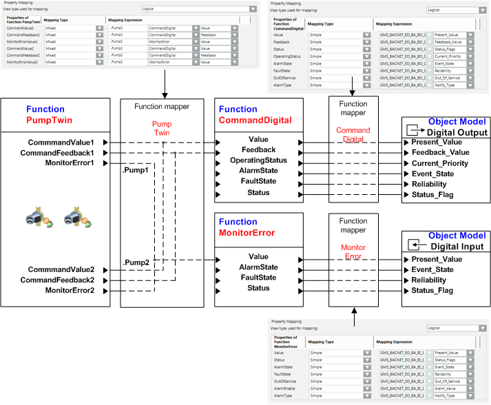 Example 5 shows Pump1 and Pump2 with additionally engineered hierarchy object below the PumpTwin Function. Each hierarchy object has a subordinate CommandDigital and MonitorError Function for its functionality. Making the hierarchical objects .Pump1 and Pump.2 part of the TwinPump Function results in unique individual object information.