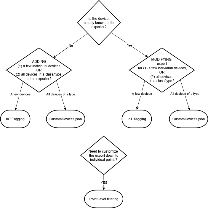 To add one or a small number of devices, it is generally recommended that you apply the “IoT” tag to those specific devices. When you want to add all the devices of a type to the exporter, use the CustomDevices.json file.