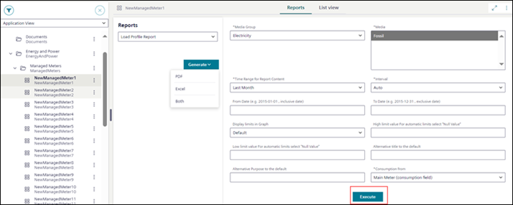 In Application View, select the System Browser object on which a web application rule is configured. For example, select System Browser object ManagedMeters > NewManagedMeter1 on which [Load Profile Report] web application rule is configured.