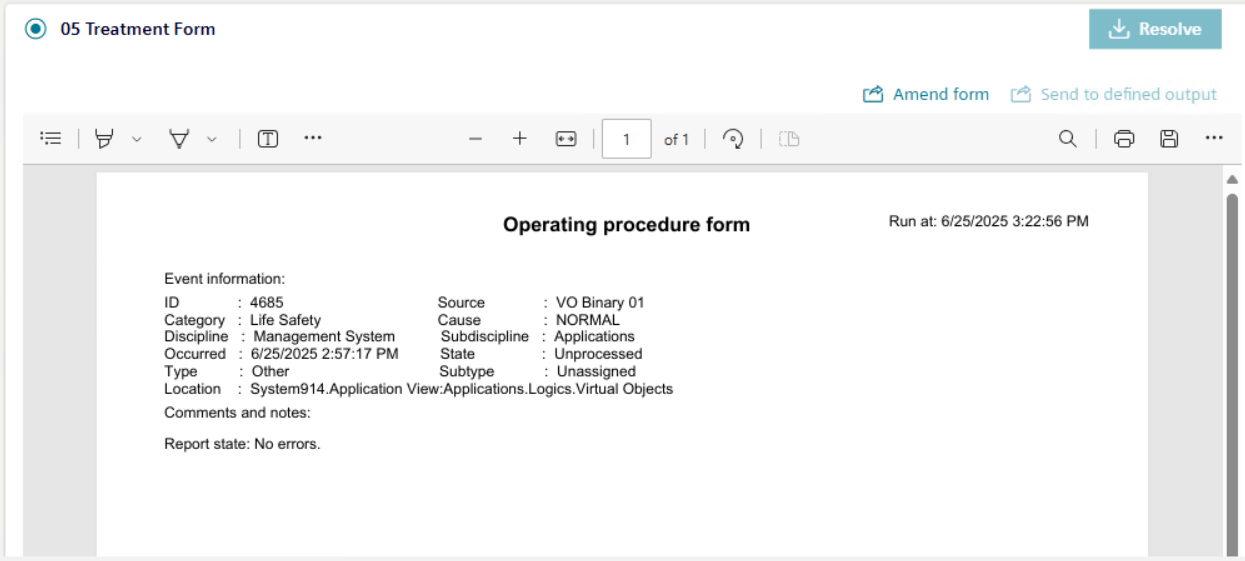 If multiple PDF files are generated for an event that has triggered assisted treatment and the operating procedure includes the treatment form step, then the history area is displayed showing an entry for the report and sub-entries for all individual PDF files. -You can select the individual PDF files in the History area and the respective PDF gets displayed in the preview area. After the report is generated, displayed, and sent to defined output, only then the step can be marked as resolved.