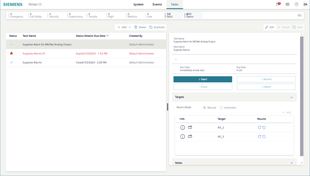 The operator tasks are in the Tasks tab. From here you can start and monitor existing tasks, as well as configure new ones. For instructions, see the step-by-step section.