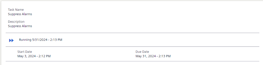 When a task is selected in view mode, the task details display the name/description of a task, and when it begins and ends: