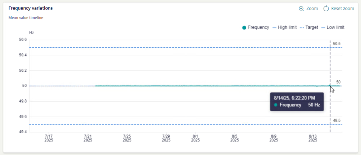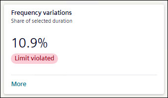 Frequency variations tile shows the percentage of hours frequency variation occurred over the selected timeline. The tile shows the status of frequency variation as All Ok, Warning, or Limit Violated as per Grid code EN 50160.