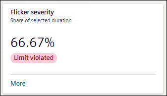 Flicker severity tile shows the percentage of hours flicker severity occurred over the selected timeline. The tile shows the status of flicker severity as All Ok, Warning, or Limit violated as per Grid code EN 50160.