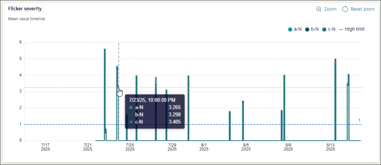 For Flicker Severity graph, X-axis shows selected timeline and Y-axis shows magnitude of flicker.