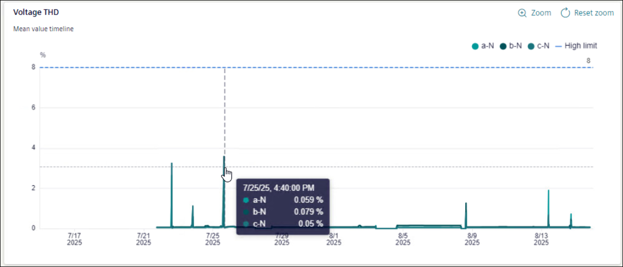 In Voltage THD graph, X-axis shows selected timeline and Y-axis shows percentage of distortion. Hover mouse on the graph to get details.