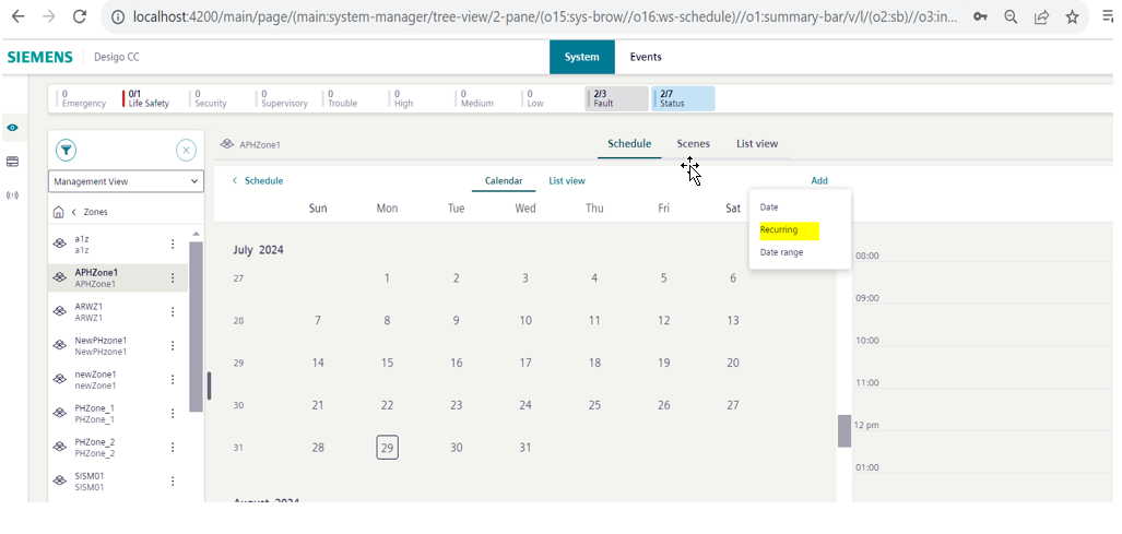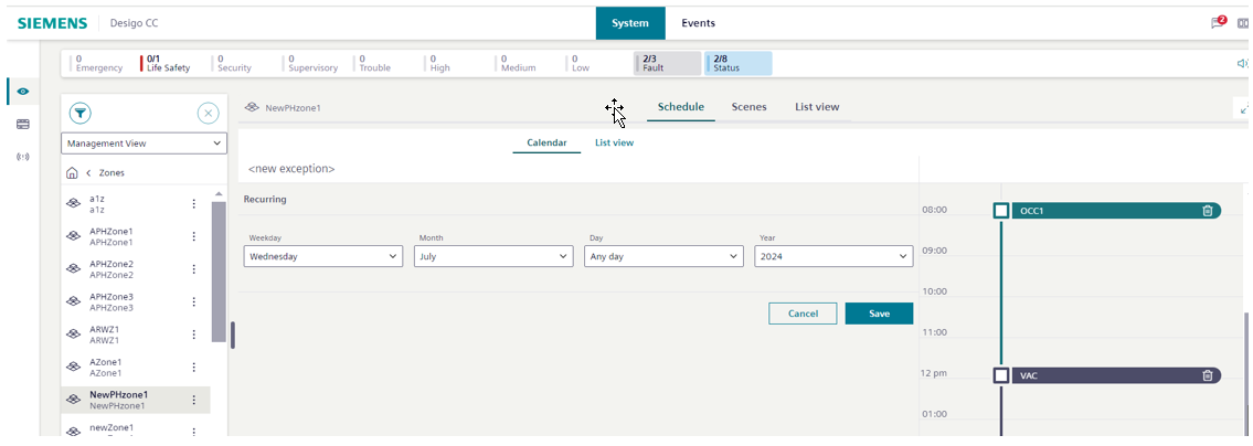 - Differences in representation due to full day exceptions. After a user saves a date exception and navigates to the zone overview page, the full day exception will not appear. Once the zone representation is re-read, the full day exception will appear (there will be no impact from mode switching points).