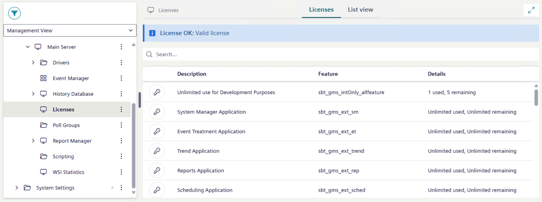 - Select Project > Management System > Servers > Main Server > Licenses.