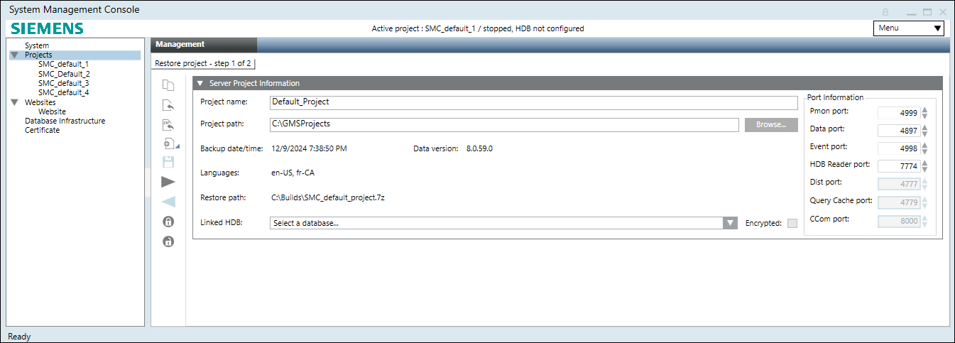 Using SMC, you can restore a compressed project/project template only on a Server. During the restore process, the SMC internally checks if the backup selected for restore is compatible with the current Data version or if it needs an upgrade.