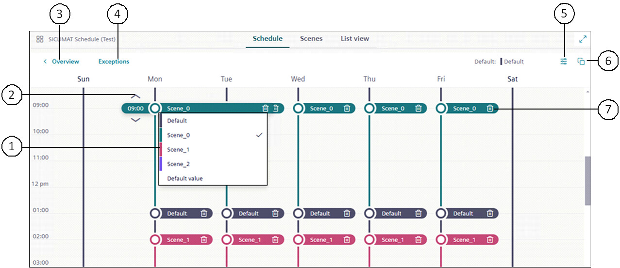 2 | Schedule tab | Displays information on the weekly schedule and exception entries of the selected schedule. |