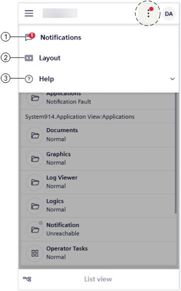 In Flex mobile view, you can tap the more option icon on top right of the screen to access a set of options of the Desigo CC Flex mobile web app.