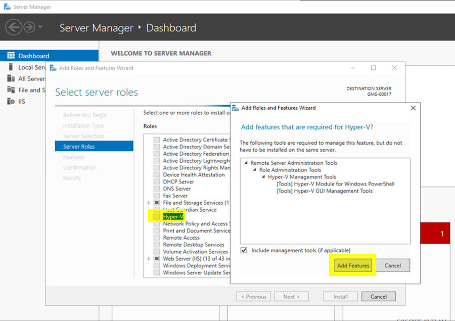 This section describes the steps to install and enable the Hyper-V role on the server. This action activates the core virtualization platform required to create and manage virtual machines.