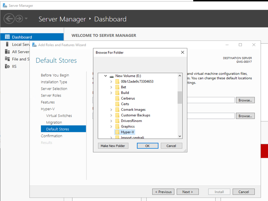 - On the Default Store page select the location for storing VMs data (create a new folder), then select Next.